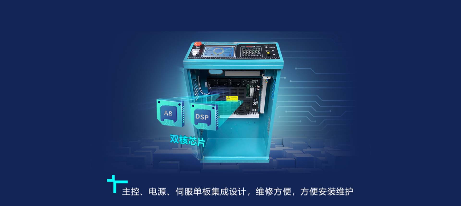 雙核 A8 芯片,主(zhu)控、電(dian)源、伺服單(dan)闆集(ji)成(cheng)設(shè)計(ji),效率高(gao), 速(su)度快,方(fang)便安(an)裝(zhuang)維(wei)護